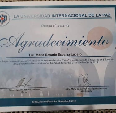 Agradecimiento por impartir la conferencia "Trastornos del Desarrollo en los Niños" a los alumnos de la Maestría en Educación de la Universidad Internacional de La Paz.
